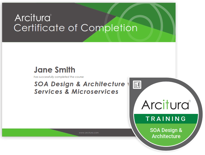 Un ARQUITECTO DE SOA CERTIFICADO de Arcitura Education Inc. demuestra competencia en los modelos de arquitectura tecnológica y la mecánica de las implementaciones de servicios y composición de servicios, mediante el dominio de patrones, principios, prácticas y tecnologías estándar de la industria necesarios para diseñar soluciones modernas basadas en servicios.